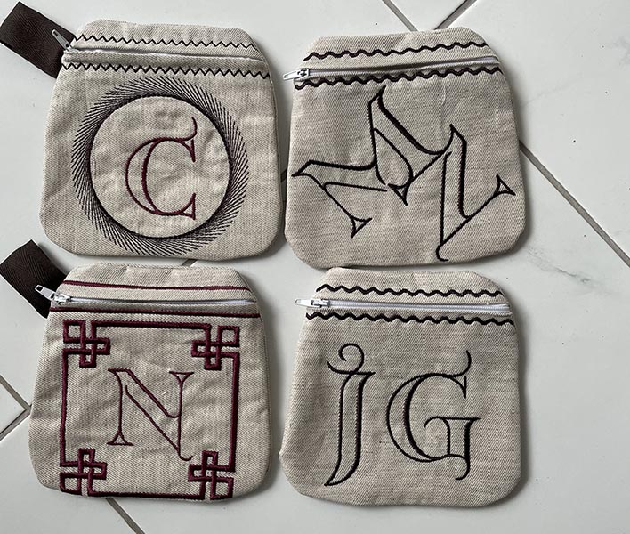 Attention : tous les cadres ne conviennent pas à toutes les lettres, en particulier aux lettres très larges comme le M ou le W, ou aux lettres très hautes comme le J. Il est bien sûr très facile dans Inkscape de modifier le positionnement de la lettre par rapport au cadre si elle ne convient pas, ou de modifier la forme d’un cadre, par exemple en transformant un cercle en ellipse pour accueillir un J récalcitrant.